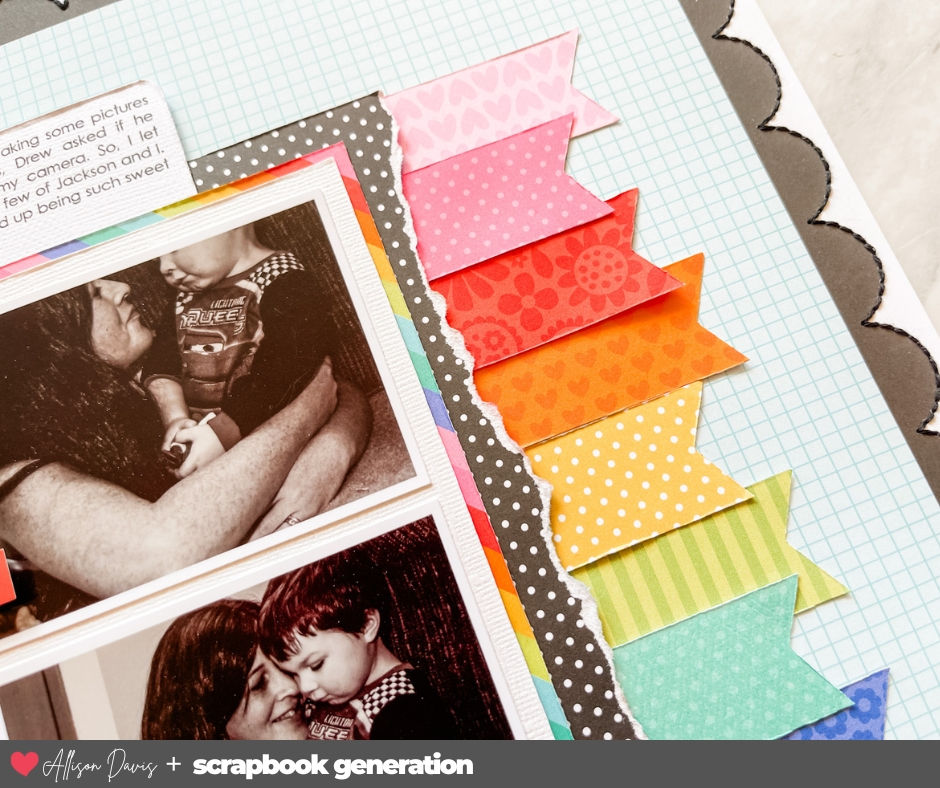 The last detail I changed was moving the title and journaling to fit with my photos and the other changes I made. The sketch has the title and journaling on top of the banner strips and slightly overlapped on the photos, but that just wouldn't work on my layout. My banner strips are shorter and there isn't really room to overlap onto the photos without covering part of Jackson.