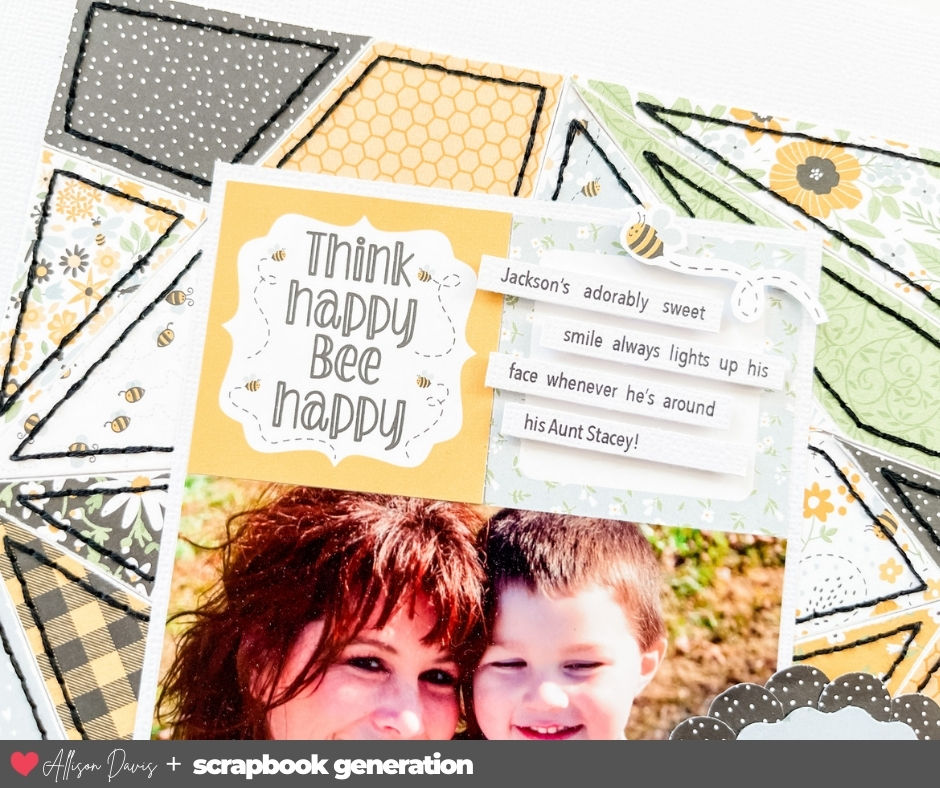 Supplies used - Cardstock: American Crafts; Patterned paper and die cuts: Echo Park "Bee Happy"; Embroidery floss: DMC; Computer fond: Avenir Next Condensed
